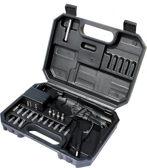 Аккумуляторная отвертка ВИХРЬ ОА-3,6-К – бытовой ручной электроинструмент для закручивания и откручивания шурупов, саморезов, винтов, дюбелей и других видов крепежных изделий. Питание от встроенной литий-ионной аккумуляторной батареи. Кнопка переключателя служит для изменения направления вращения шпинделя (реверс). Среднее положение переключателя реверса блокирует выключатель отвертки.Комплектация:Отвертка со встроенным аккумулятором 1шт.Бита 18 шт.Адаптер-удлинитель для бит 1 шт.Сетевой адаптер 1 шт. Паспорт 1 шт. Упаковка (кейс) 1 шт.