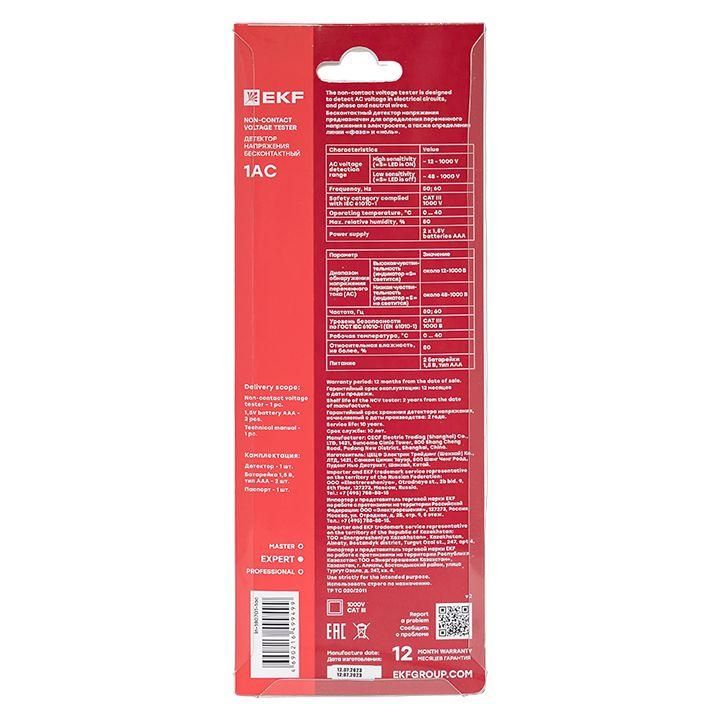 Детектор напряжения бесконтактный 1AC EKF Expert предназначен для бесконтактного определения переменного напряжения в электросети, а также определения фазного и нулевого проводов.