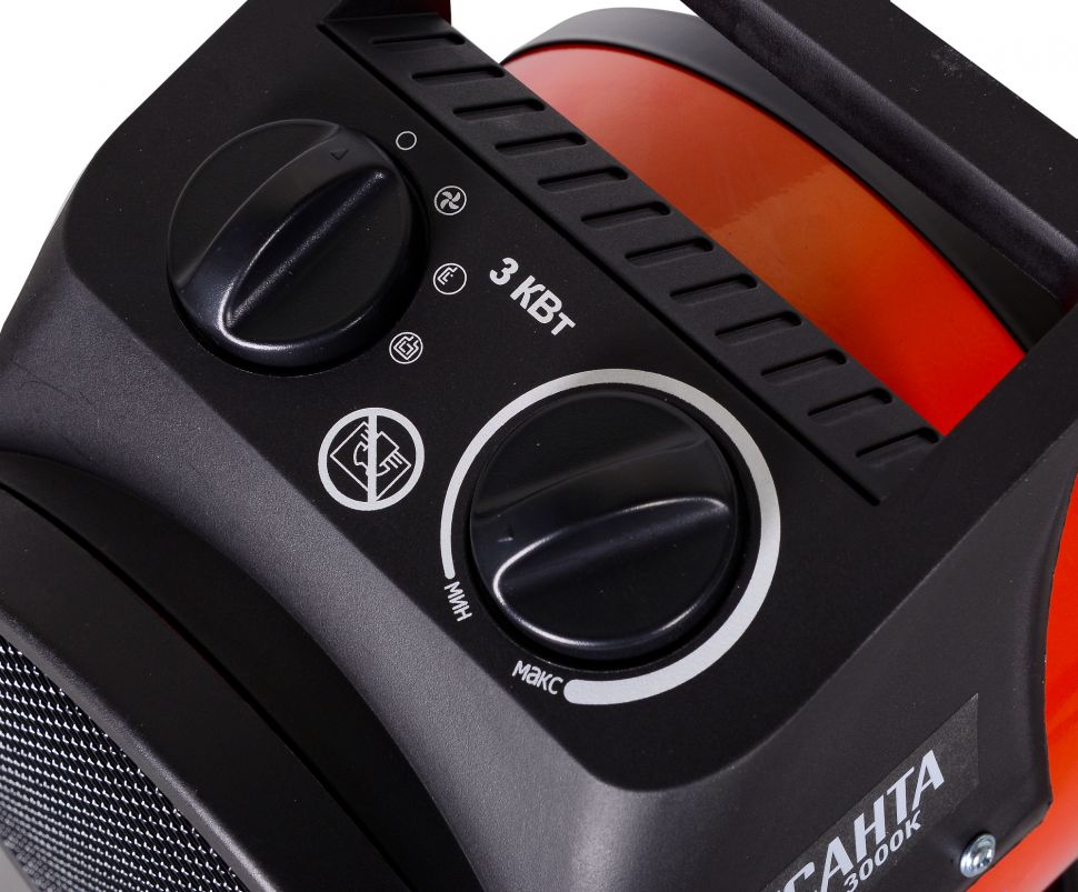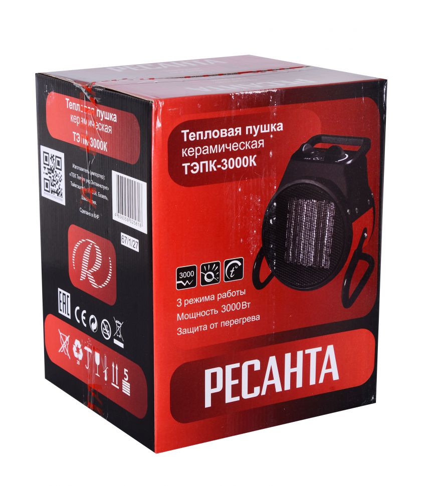 Тепловая электрическая пушка РЕСАНТА ТЭПК-3000K предназначена для вентиляции и обогрева жилых и производственных помещений, складов, гаражей, а также для обогрева и сушки в строительстве. Прибор относится к тепловым пушкам круглого типа. Нагревательный элемент - керамический. Данная модель рассчитана на питание от электросети переменного тока частотой 50 Гц, номинальным напряжением 220-230В (однофазная). Устанавливается на полу. Обогреватель оснащен регулировкой режимов работы (мощности): Режим 1: 25 Вт (в этом режиме работает только вентилятор. Функция обогрева отключена) Режим 2: 2000 Вт Режим 3: 3000 Вт Преимущества: Быстрый нагрев Не сжигает воздух Защита от перегрева Терморегулятор Функциональные особенности: Терморегулятор – предназначен для регулировки температуры; Регулировка режимов работы – данная регулировка предназначена для выбора режимов работы; Режим выключения – данная функция предназначена для отключения режимов работы; Режим вентилятора – данная функция предназначена для включения вентилятора, а также применяется на 10-15 секунд перед отключением устройства для охлаждения тэнов; Режим работы на 70% мощности – данная функция позволяет включить вентиляцию с включением половины нагревательных элементов; Режим работы на 100% мощности – данная функция позволяет включить вентиляцию с включением всех нагревательных элементов. Важно: не накрывать и не ставить тепловую пушку на ковровые покрытия. Помещения должны быть сухими, с температурой от минус 10 до плюс 40°С. Комплектация: Электрическая пушка — 1 шт. Руководство по эксплуатации — 1 шт. Упаковка — 1 шт.