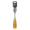 Трещотка предназначена для быстрого и эффективного закручивания или откручивания крепежа. Инструментом удобно пользоваться в условиях ограниченного пространства, когда нет возможности выполнить полный оборот вокруг гайки. Используется в быту и при авторемонте. Особенности: Рабочая часть изготовлена из CrV стали и обладает особой прочностью. Хромированное покрытие надёжно защищает трещотку от коррозии. Трещотка снабжена механизмом быстрого сброса насадок, что ускоряет процесс работы. Двухкомпонентная рукоятка не выскальзывает из ладони. Трещоточный 72-зубцовый механизм обеспечивает плавность хода, а малый угол поворота в 5° позволяет работать в ограниченном пространстве. Наличие в трещотке храпового механизма обеспечивает быструю смену направления вращения и упрощает работу в труднодоступных местах.