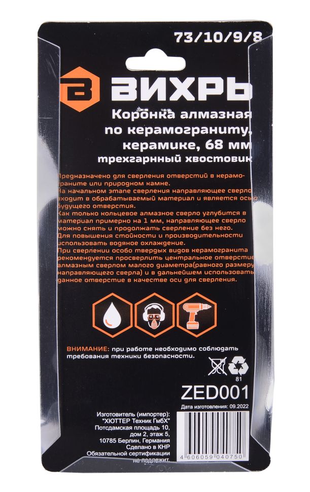 Читать все статьиКоронка алмазная Вихрь по керамограниту/керамике, 68 мм