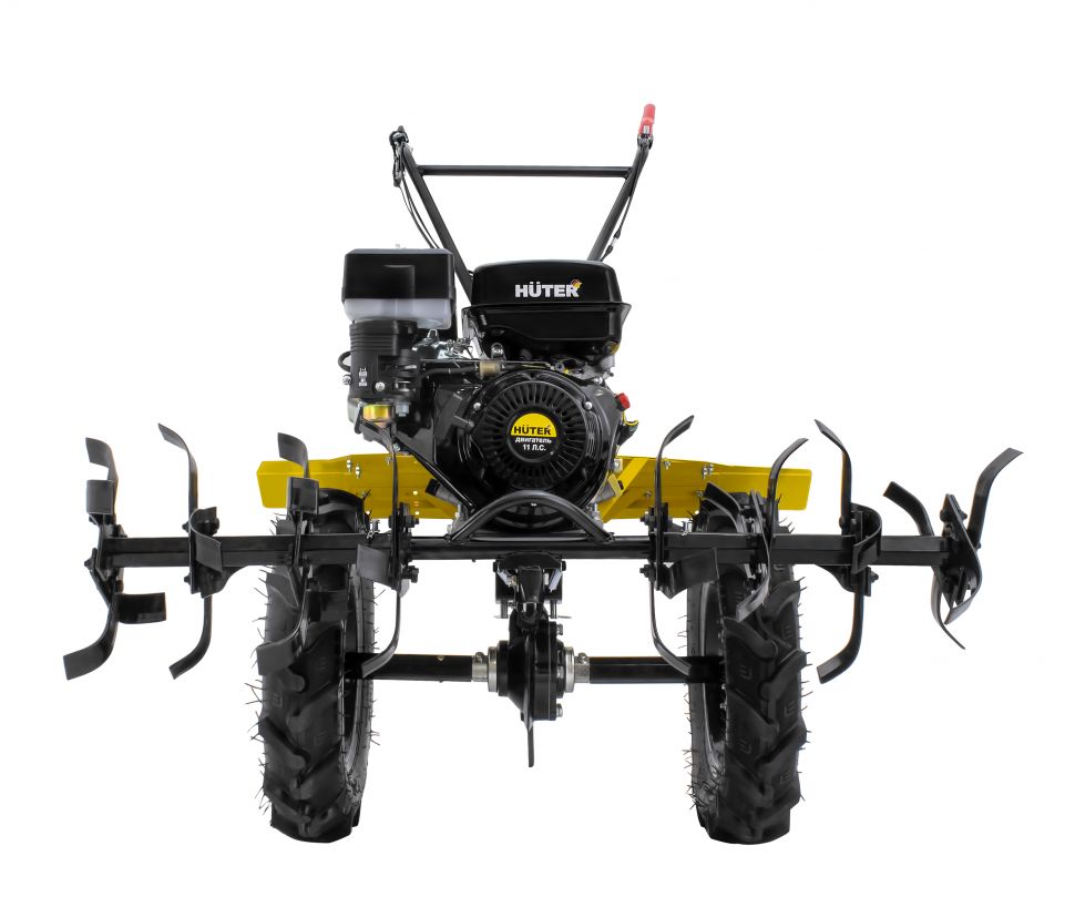 Мотоблок HUTER MK-11000(M) используется для обработки почвы методом культивации, то есть её рыхления без переворота почвы, выравнивания, других операций. Агрегат дает хорошие результаты на приусадебных и фермерских хозяйствах и дачных участках, на ограниченных территориих, междурядьях, на клумбах и возле деревьев. Устройство - Двигатель. На мотоблоках HUTER применяются бензиновые двигатели внутреннего сгорания. Двигатели культиваторов снабжаются автоматическими регуляторами частоты вращения, упрощающими работу оператора. Диапазон номинальной мощности линейки наших культиваторов позволяет выбрать подходящий для любых видов работ. - Сцепление и редуктор обеспечивают передачу вращающего момента от двигателя на рабочий вал. - Система агрегатирования предназначена для сопряжения мотоблока с навесным оборудованием, которое устанавливается на рабочую ось или раму. - Система управления. Так как вовремя земляных работ оператор шагает за мотоблоком, все органы управления должны приводиться в действие только руками оператора.Технические характеристики - Мощность – определяет производительность культиватора. Чем мощнее двигатель установлен на культиватор, тем более жесткую почву и большую глубину он может обрабатывать. - Скорости – позволяют выбрать подходящий диапазон для более качественной обработки почвы, а также облегчают извлечение из земли агрегата после окончания работ посредством задней передачи. - Ширина обработки – зависит от установленных лезвий, может достигать до 85 см со стандартными лезвиями и до 120см с дополнительными. Чем больше ширина обработки, тем эффективней работа культиватора. Но бывает необходимо вспахивать узкие полоски земли, для чего лезвия имеют составное устройство, т.е. есть возможность обрабатывать полосы шириной 30 и 50см. - Глубина обработки – зависит от мощности двигателя и установленных лезвий. Чем больше глубина обработки, тем более качественно и эффективно будет вспахана почва. - Объем топливного бака – определяет время непрерывной работы культиватора без дозаправки.Особенности - Возможность регулировки глубины и ширины обработки почвы. - Защита от низкого уровня масла. При уровне масла ниже допустимого мотоблоки и мотокультиваторы Huter не заводятся глохнут, если это случилось во время работы. - Возможность выбрать скорость (для тяжелых и средних культиваторов) и две скорости работы "вперед и назад" для всей линейки культиваторов. - Колесо в передней части мотоблока для удобства перемещения либо стояночная опора (сошник) в задней для удобства хранения. - Возможность простой разборки культиватора обеспечивает удобство при транспортировке и хранении.