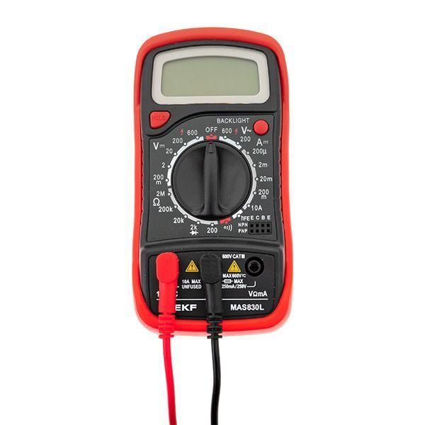 Мультиметр — это универсальный измерительный прибор. В функционал цифрового мультиметра MAS830B EKF Master входит измерение переменного напряжения до 600В, измерение постоянного напряжения до 600В, измерение постоянного тока 10А, измерение электрического сопротивления до 2МОм, проверка диодов и транзисторов, проверка целостности цепи (звуковая прозвонка), подсветка дисплея и функция DATA HOLD.