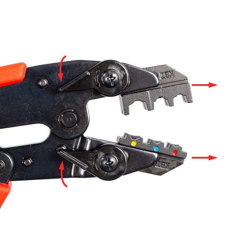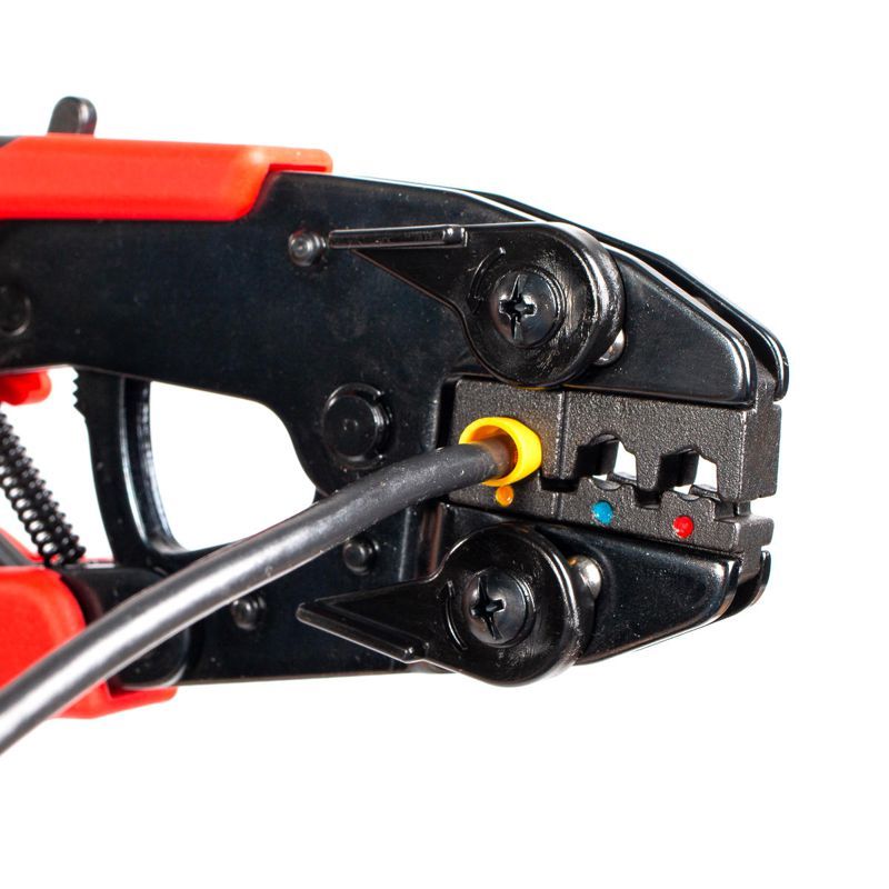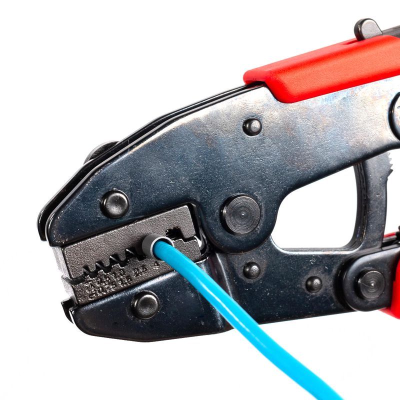 • Состав набора: • пресс-клещи CTB с механизмом быстрой смены матриц • матрицы МПК: 01/02/03/04/05 • прочная сумка на молнии • Совместимость: все матрицы МПК (КВТ) • Фиксация и высвобождение матриц нажатием на рычаги • Материал корпуса: 3-миллиметровая сталь • Усиленный трехшарнирный рычажный механизм • Удлиненные нескользящие рукоятки, позволяющие производить опрессовку двумя руками • Храповой механизм, обеспечивающий блокировку обратного хода до завершения полного цикла опрессовки • При работе требуют на 30% меньше усилий, чем аналогичный инструмент • Регулятор прижимного усилия матриц • Вес набора/инструмента: 1.05/0.62 кг • Длина инструмента: 260 мм • Габариты сумки: 280х125х50 мм