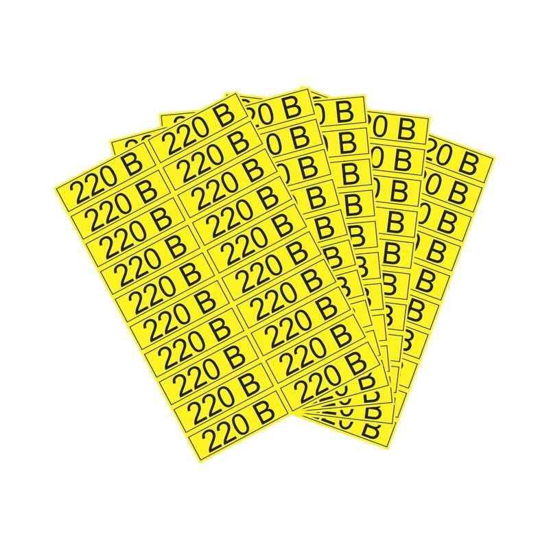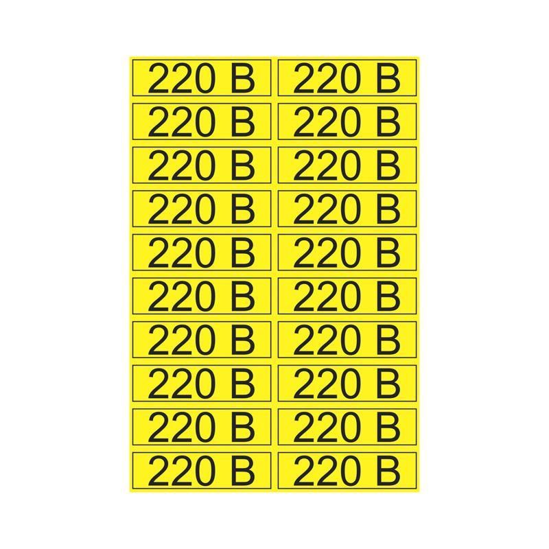 Знак электробезопасности (наклейка) указатель напряжения «220 В» — это информационный знак, который размещается для информирования о напряжении в электрической сети, около розеток и выключателей. Такие наклейки предназначены для предупреждения и информирования окружающих, а также для организации мест работы электромонтажных бригад, несут дополнительную информационную нагрузку. • Знак хорошо виден и сохраняет яркость цветов долгое время даже при постоянном использовании. • Имеет хорошую устойчивость к смазыванию, стойкость к прямым солнечным лучам, перепадам температуры, мелким механическим воздействиям. • Выполнен из прочного, износостойкого материала, легко клеится, крепко держится и не оставляет следов после снятия (* предназначен для нанесения на ровную сухую поверхность). Характеристики: Тип продукта: наклейка (ПВХ пленка с полуглянцевой поверхностью, бумажная подложка) Комплект набора: 100 наклеек размером 15 (вертикаль) х 50 (горизонталь) мм (5 листов по 20 наклеек на каждом) Самоклеящийся: да Формат: прямоугольник Изображение: надпись Цвет: желтый, черный Страна-производитель: Россия
