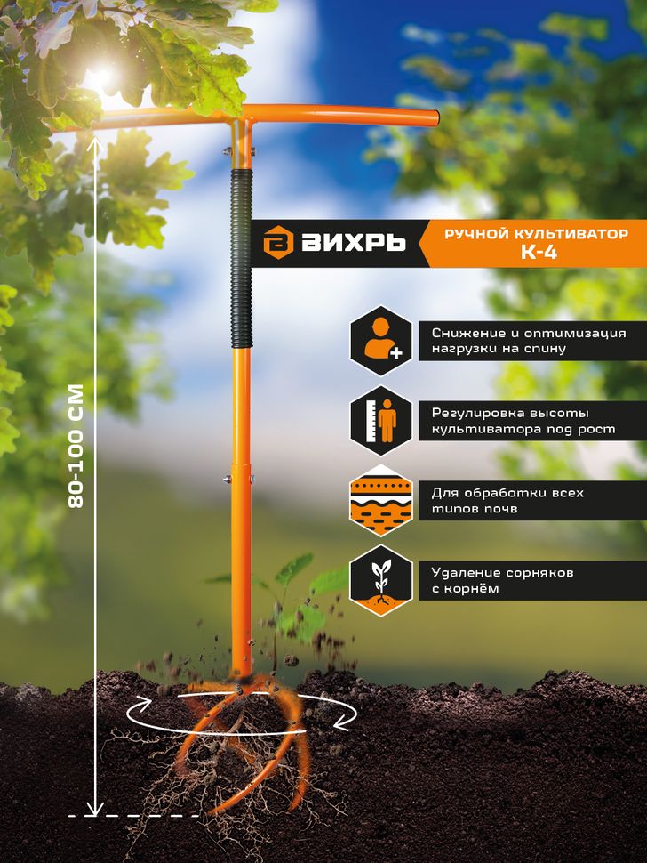 Ручной культиватор - это инструмент, предназначенный для рыхления почвы, удаления сорняков, подготовки лунок и т.д. Он позволяет значительно снизить нагрузку на спину в отличие от классической лопаты, что особенно важно для пожилых пользователей. Принцип работыБлагодаря уникальной конструкции выполняется рыхление и удаление сорняков из почвы при минимальном физическом усилии. Погружение рабочей части осуществляется вкручиванием. При этом не требуется больших усилий и нажима. А подъём почвы осуществляется либо дальнейшим поворотом инструмента без погружения, либо наклоном. Во время работы сохраняется анатомически правильное положение тела, поэтому после работы не будет болей в мышцах и дискомфорта.Регулировка высоты культиватора под рост - от 80 до 100 см.Ручной культиватор будет незаменим для работы на придомовых территориях, огородах, садовых участках.
