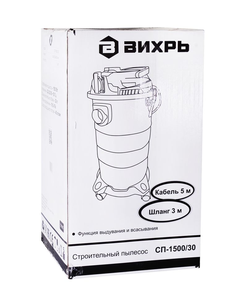 Строительный пылесос СП-1500/30 Вихрь предназначен для сухой и влажной уборки помещений, а также для совместного использования с электроинструментом при принудительном удалении продуктов сгорания, пиления. Может убирать крупные частицы мусора, а также воду.Технические характеристики: Рабочее разряжение -17,5 кПаСкорость воздушного потока - 40 л/секРежимы работы - всасывание и выдуваниеРозетка для подключения инструмента - естьМощность подключаемого инструмента - 100-2000 ВтДлина гофрированного шланга - 3 мДлина шнура питания - 5 мОбъем бака - 30 лВ стандартный комплект поставки входят:Пылесос с сетевым кабелем 5 метров – 1 шт.Шланг гофрированный 3 метра – 1 шт.Трубка пластиковая – 2 шт.Насадка со щеткой для пола – 1 шт.Насадка щелевая – 3 шт.Фильтр НЕРА (сухая уборка, красный) – 1 шт.Фильтр поролоновый (влажная уборка) – 1 шт.Мешок тканевый для сбора пыли – 1 шт.Мешок бумажный для сбора пыли – 1 шт.Колеса (для пылесоса) – 4 шт.Паспорт и упаковка.