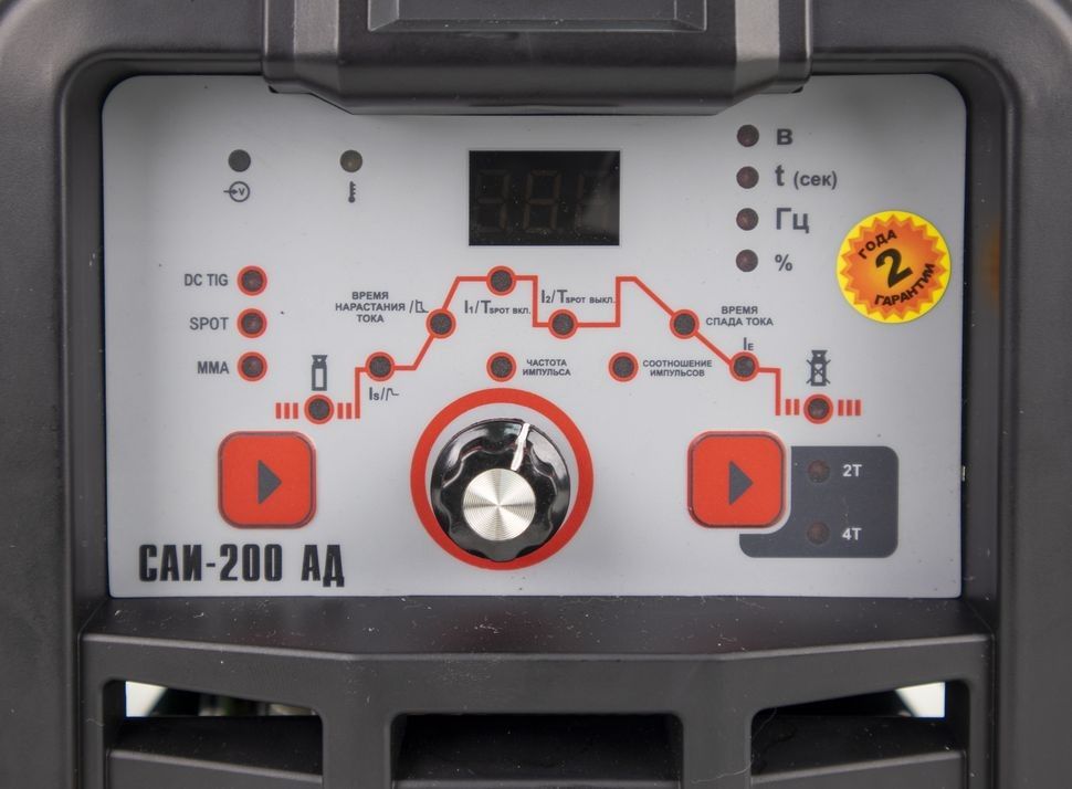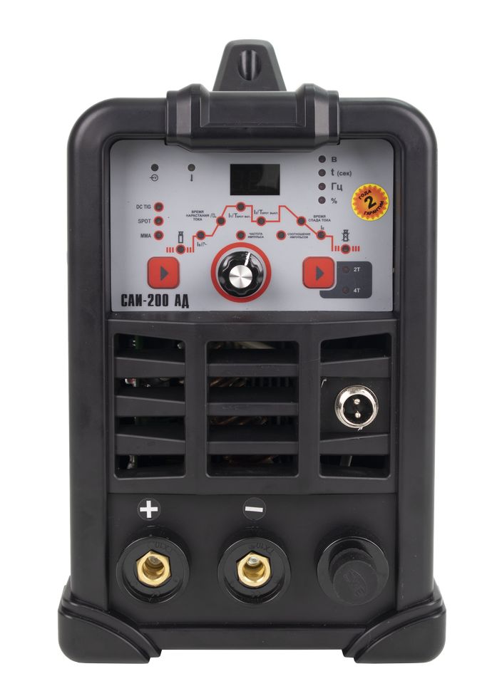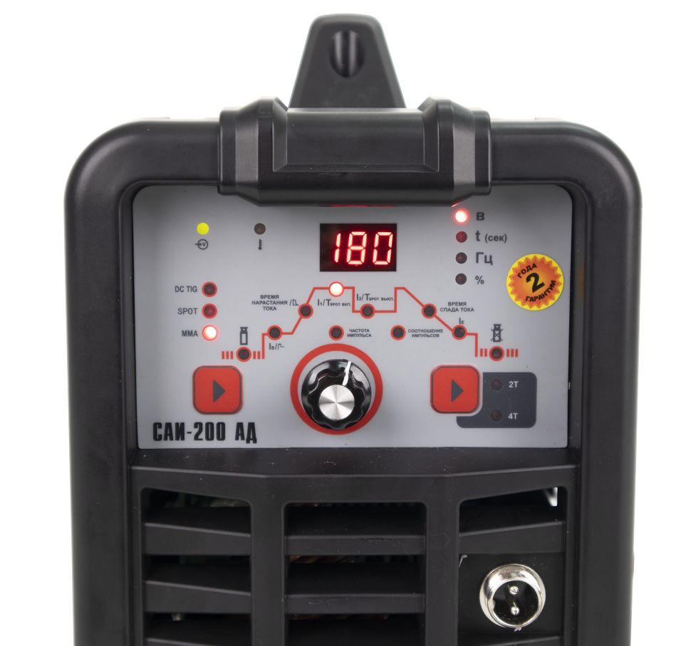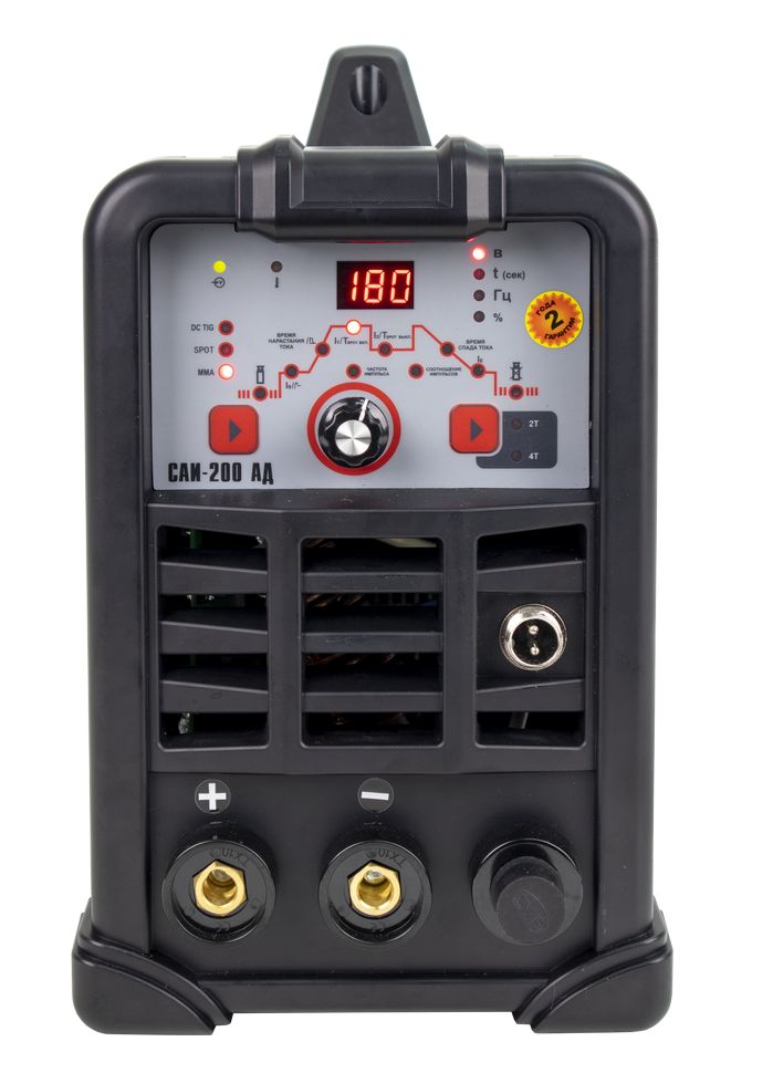 Сварочный аппарат РЕСАНТА САИ АД (далее САИ АД) – современный портативный однофазный инверторный сварочный аппарат с функцией аргонодуговой сварки постоянным током (TIG DC). Данный аппарат изготовлен по передовой IGBT технологии. Аппарат позволяет производить: Сварку постоянным током неплавящимся электродом в среде защитного газа углеродистых и нержавеющих сталей (режим TIG). Сварка осуществляется постоянным током в среде аргона. Отличительной особенностью рассматриваемого вида сварки являются два главных компонента: неплавящийся электрод и защитный газ (аргон). Сварка-SPOT позволяет выполнить быстро и качественно соединение листов металлических конструкций с применением местного воздействия тока определенной силы и нагрева свариваемых заготовок. В тех зонах, где электроды касаются металла, происходит его плавление Защита электрической дуги необходима с целью препятствия вступления расплавляемого металла в контакт с окружающей средой, поскольку данное взаимодействие (при окислении азота и кислорода) приводит к образованию оксидов и нитритов, наличие которых в металле приводит к дефектам сварного шва. С этой целью и применяются защитные газы в баллонах, например, аргон. Ручную дуговую сварку штучным покрытым электродом на постоянном токе электродами с рутиловым и основным покрытием (режим ММА). Для сварки электродом защитный газ не требуется