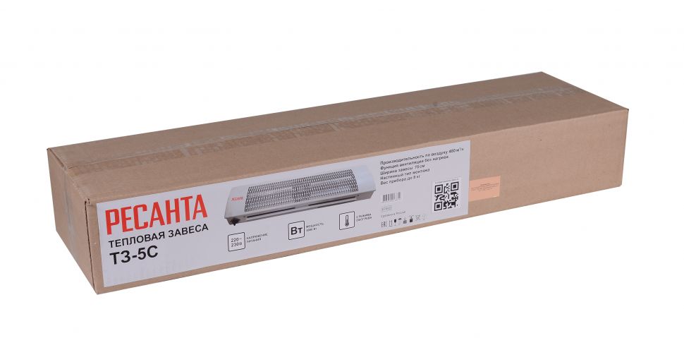 Тепловая завеса РЕСАНТА ТЗ-5С предназначена для защиты отапливаемых помещений от холодного воздуха, попадающего внутрь через открытые двери, ворота, рабочие окна. Мощный поток воздуха, создаваемый завесой, образует невидимую преграду холодному наружному воздуху и сохраняет теплый воздух внутри помещения.Летом, когда отключено отопление, завеса может быть использована для защиты кондиционируемого помещения от проникновения внутрь теплого наружного воздуха, пыли, дыма, насекомых и т.п.Завесу можно устанавливать только горизонтально (над дверным проемом), в закрытых помещениях с температурой воздуха от +1С до + 35С, в условиях, исключающих попадание на нее капель, брызг и атмосферных осадков. Завеса наиболее эффективна при установке в тамбуре помещения над дверными проемами высотой до 2,2-2,5 м., для защиты открытых оконных проемов высотой до 1,5 м.Комплектация: Тепловая завеса — 1 шт. Руководство по эксплуатации — 1 шт. Упаковка — 1 шт.Как выбрать тепловую завесу?Тепловые завесы подбирают по высоте и ширине защищаемого дверного проема. Поэтому основные параметры выбора тепловой завесы - это ее длина и производительность по воздуху:Длина завесы должна быть равна или больше ширины проема, поскольку только в этом случае поток воздуха будет целиком его перекры-вать и не даст холодному воздуху попасть внутрь. Если проем более 3 метров в ширину, то следует устанавливать несколько аппаратов вплотную друг к другу.Чем выше проем, тем выше должна быть производительность за-весы. Для защиты окон отпуска товаров, касс, киосков подойдут завесы про-изводительностью 300 куб.м/ч. Для защиты стандартного дверного проема шириной 0,8 м и высотой до 2,5 м требуется завеса производительностью 1000 куб.м/ч., при наличии тамбура - 500 куб.м/ч. Если в помещении есть несколько дверных проемов, необходимо установить завесы с увеличенной производительностью, чтобы исключить потерю тепла со сквозняками.