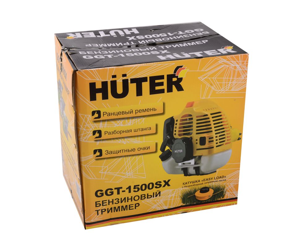 Триммер бензиновый HUTER GGT-1500SX - новинка 2019 года. Новая модель представляет собой отличный инструмент для скашивания травы и современный вариант ручной косы. Косить траву, особенно если она высокая, триммером очень удобно. Как правило, владельцы участков отдают приоритет бензиновым моделям, ведь не на каждой даче есть электричество, а провода создают дополнительное неудобство.Новая модель триммера Huter отличается тем, что в комплектацию входят ранцевый ремень, диск 40 TP, а также защитные очки. Кроме того, у GGT-1500SX штанга разборная в отличие от GGT-1500TX, остальные параметры у обоих моделей одинаковые.Преимущества: - Бензиновый триммер Huter обладает полной автономностью, можно работать где угодно без связи с источниками энергии. - Топливный бак устройства полупрозрачен и позволяет визуально следить за уровнем его наполнения. - Удобная рукоятка позволяет регулировать параметры агрегата, прочно его удерживать, а так же направлять его рабочую часть в нужное место. - Надежный и оборотистый двухтактный двигатель с системой антивибрации и легким ручным запуском позволяет долго работать. - Управление триммером расположено прямо на рукоятке.Система безопасности: - Защитный кожух оберегает от отскоков камней и другого мелкого мусора в сторону пользователя. - Блокиратор курка газа позволяет избежать случайного нажатия курка и вращения режущего инструмента при заведенном двигателе. - Антивибрационная система триммера повышает комфорт при работе триммером.Обратите внимание! Топливную смесь следует приготавливать из бензина с октановым числом не менее 92 и специального масла. Необходимо использовать высококачественное масло, предназначенное для двухтактных двигателей с воздушным охлаждением. Запрещается использование масла, предназначенного для 2-х тактных двигателей с водяным охлаждением (для лодочных моторов)! Пропорция приготовления указывается производителем масла. Если пропорция не указана, то используется 1:40.