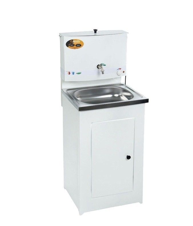 Умывальник с подогревом, белого цвета, с тумбой и пластиковой мойкой, от российского производителя ВИХРЬ. В городах все привыкли к центральному водоснабжению, но на дачах такое благо есть не у всех, что вызывает определённые неудобства, но проблема вполне решаема. При помощи умывальника можно умыться, вымыть не только руки, но ещё и посуду и овощи. Такое устройство просто незаменимо в быту, с ним комфортно и удобно. Умывальники настолько удобны, что могут стать заменой полноценного водопровода.Умывальник ВИХРЬ отличается особой функциональностью, так как его можно установить как внутри дома, так и снаружи. Внутри тумбочки ставиться ведро или шланг для слива воды. Так как в таком умывальнике есть раковина, то его можно свободно использовать для мытья посуды.Умывальник с подогревом наиболее комфортный вариант для дачи, т.к. в случае отсутствия центрального водоснабжения, он поможет решить проблему подачи воды и сделает её горячей. Такой умывальник можно установить в летней кухне, внутри дома, на террасе, то есть там, где имеется розетка для подключения нагревательного элемента. Преимущества: Гарантия 1 год. Наличие термостата (при отсутствии воды, подогрев отключается). Регулятор нагрева воды (можно задать нужную температуру воды). Швы дополнительно обработаны герметиком. Оцинкованный бак 17 литров. Пластиковый кран. Две поперечные планки на задней части тумбы для дополнительной устойчивости. Магниты на дверце тумбы. Порошковая покраска дает дополнительную (прочность, экологичность, защита от коррозии, электроизоляция, термозащита от -60 до +150 0С).Комплект поставки: Электроводонагреватель - 1 шт. Раковина - 1 шт. Боковина задняя - 2 шт. Стяжка задняя - 2 шт. Тумба с дверью - 1 шт. Кран (пластиковый), прокладки, слив, метизы, пробка сливная (установлена в баке) - 1 (комплект). Руководство по эксплуатации - 1 шт. Упаковка - 1 шт.