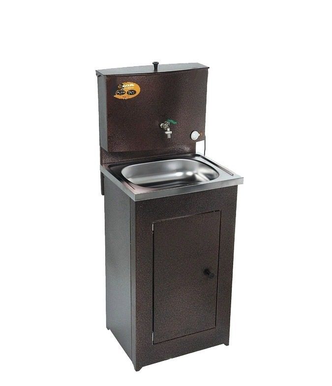 Умывальник с подогревом, медного цвета, с тумбой и нержавеющей мойкой, от российского производителя ВИХРЬ. В городах все привыкли к центральному водоснабжению, но на дачах такое благо есть не у всех, что вызывает определённые неудобства, но проблема вполне решаема. При помощи умывальника можно умыться, вымыть не только руки, но ещё и посуду и овощи. Такое устройство просто незаменимо в быту, с ним комфортно и удобно. Умывальники настолько удобны, что могут стать заменой полноценного водопровода.Умывальник ВИХРЬ отличается особой функциональностью, так как его можно установить как внутри дома, так и снаружи. Внутри тумбочки ставиться ведро или шланг для слива воды. Так как в таком умывальнике есть раковина, то его можно свободно использовать для мытья посуды.Умывальник с подогревом наиболее комфортный вариант для дачи, т.к. в случае отсутствия центрального водоснабжения, он поможет решить проблему подачи воды и сделает её горячей. Такой умывальник можно установить в летней кухне, внутри дома, на террасе, то есть там, где имеется розетка для подключения нагревательного элемента. Преимущества: Гарантия 1 год. Наличие термостата (при отсутствии воды, подогрев отключается). Регулятор нагрева воды (можно задать нужную температуру воды). Швы дополнительно обработаны герметиком. Оцинкованный бак 17 литров. Хромированный кран. Две поперечные планки на задней части тумбы для дополнительной устойчивости. Магниты на дверце тумбы. Порошковая покраска дает дополнительную (прочность, экологичность, защита от коррозии, электроизоляция, термозащита от -60 до +150 0С).Комплект поставки: Электроводонагреватель - 1 шт. Раковина - 1 шт. Боковина задняя - 2 шт. Стяжка задняя - 2 шт. Тумба с дверью - 1 шт. Кран, прокладки, слив, метизы, пробка сливная (установлена в баке) - 1 (комплект). Руководство по эксплуатации - 1 шт. Упаковка - 1 шт.