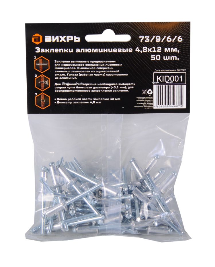 Заклёпки алюминиевые Вихрь 4,8х12 мм, 50 шт для соединения различных материалов с использованием заклёпочника. Преимущества: Лёгкий монтаж – достаточно доступа к рабочей поверхности только с одной стороны. Соединения являются очень прочными и долговечными. Низкая стоимость позволяет не экономить на материале и формировать надёжное крепление. Высокая устойчивость к агрессивному воздействию химических веществ, высоких температур и влажности. Гильзы изготовлены из качественного высокопластичного сплава алюминия, что обеспечивает прочность и герметичность соединения. Стержень из нержавеющей стали препятствует появлению коррозии.